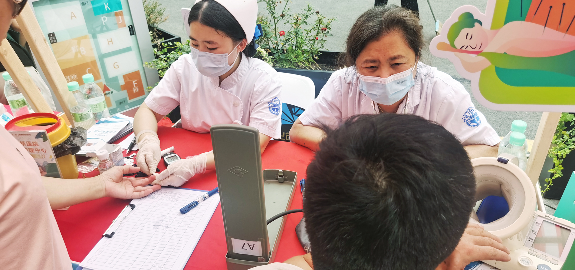 活动当天,芷江西路孔雀创意园活动现场早早便热闹起来了,居民们循声而至,有关注慢性病管理的老年人,也有咨询日常健康护理知识的中青年群体。我院老年康复护理中心的医护团队抵达后,迅速摆放好血压仪、血糖仪等基础检查设备,并将印满实用知识的健康科普手册叠放整齐,用饱满的热情投入到服务中。