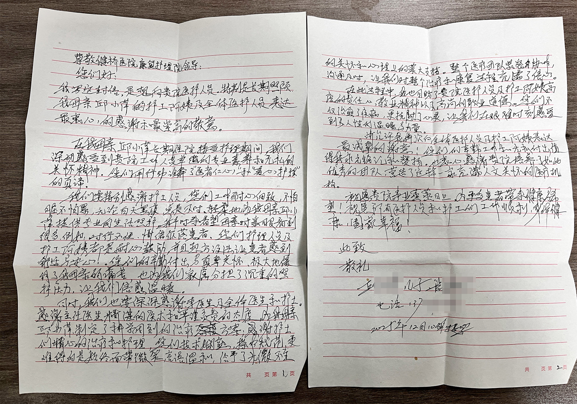薄薄一纸信,浓浓医患情 | 上海健桥医院老年康复护理中心获患者家属暖心致谢