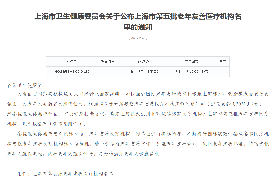 近日,上海市卫生健康委员会公布了上海市第五批老年友善医疗机构名单,经各区卫生健康委严格评审及市级专家抽查复核,我院成功入选!