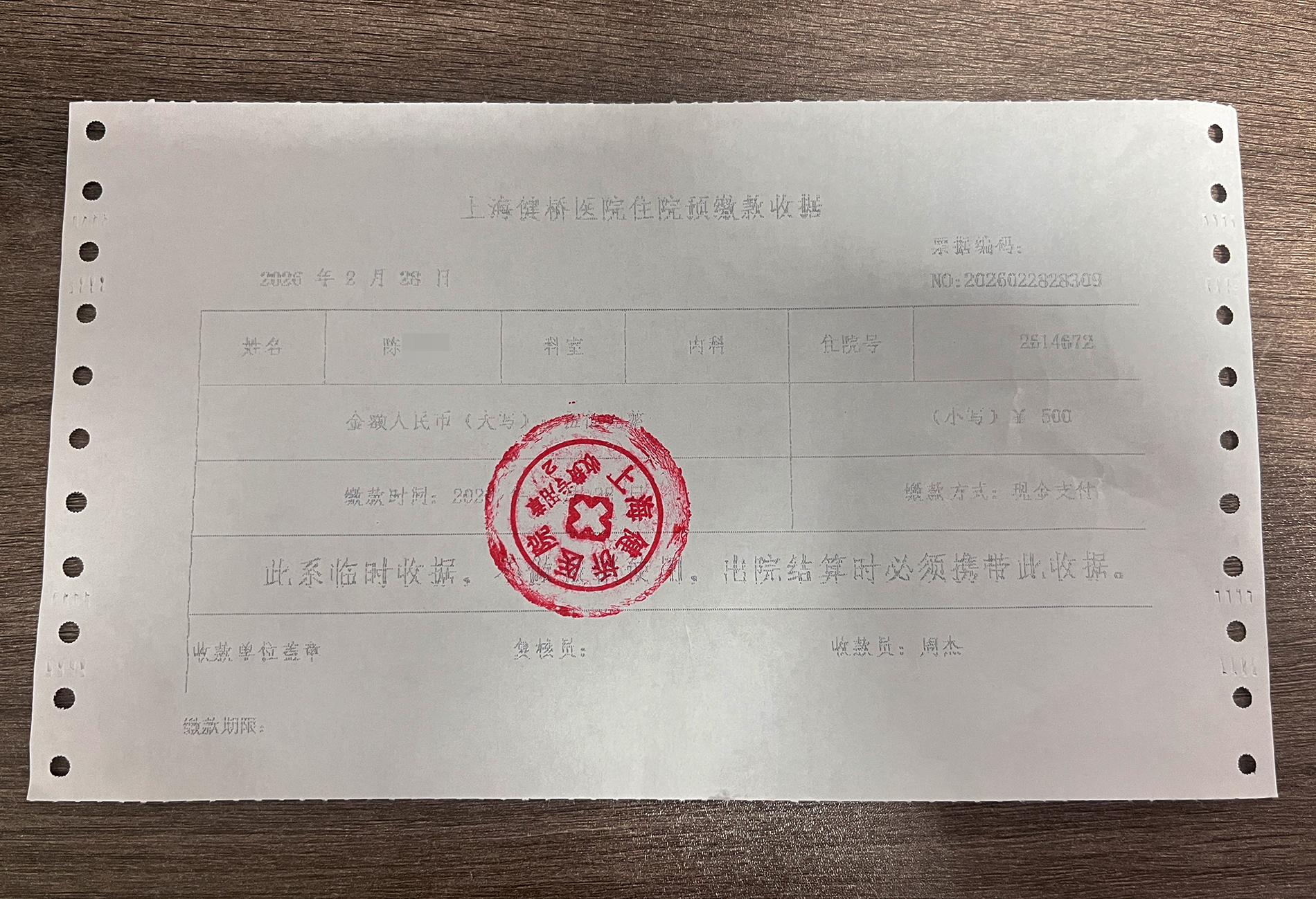 收下红包后,岳銮銮护士长没有丝毫犹豫,第一时间将情况上报医院相关科室,详细说明情况后,在院领导的见证下将500元现金全额以预缴住院费的形式,存入了陈阿姨的住院账户。